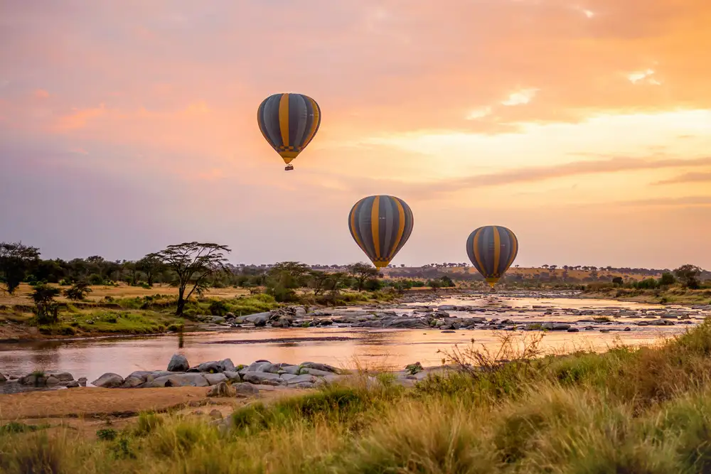 Private sunrise balloon flight over the Serengeti followed by a champagne bush breakfast — a once-in-a-lifetime cinematic moment.